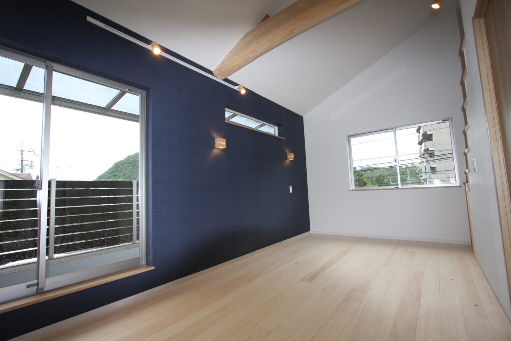 天井は斜めに高くとられていて、開放感とともに、木の梁があたたかみを添えてくれます。