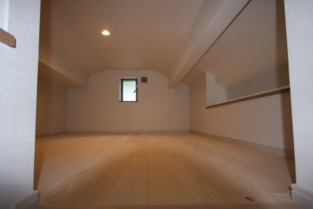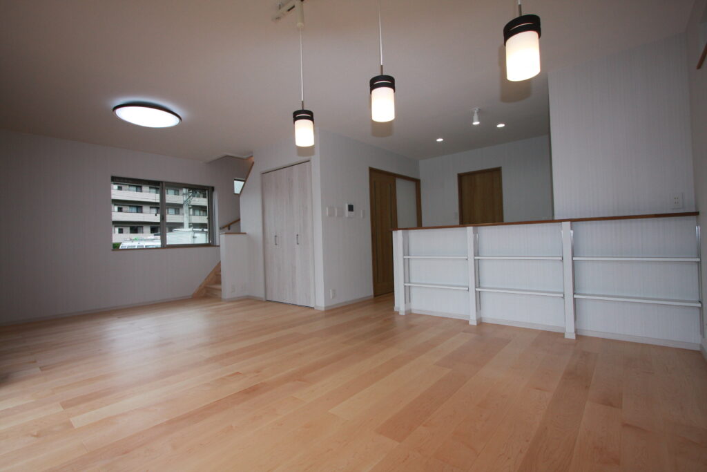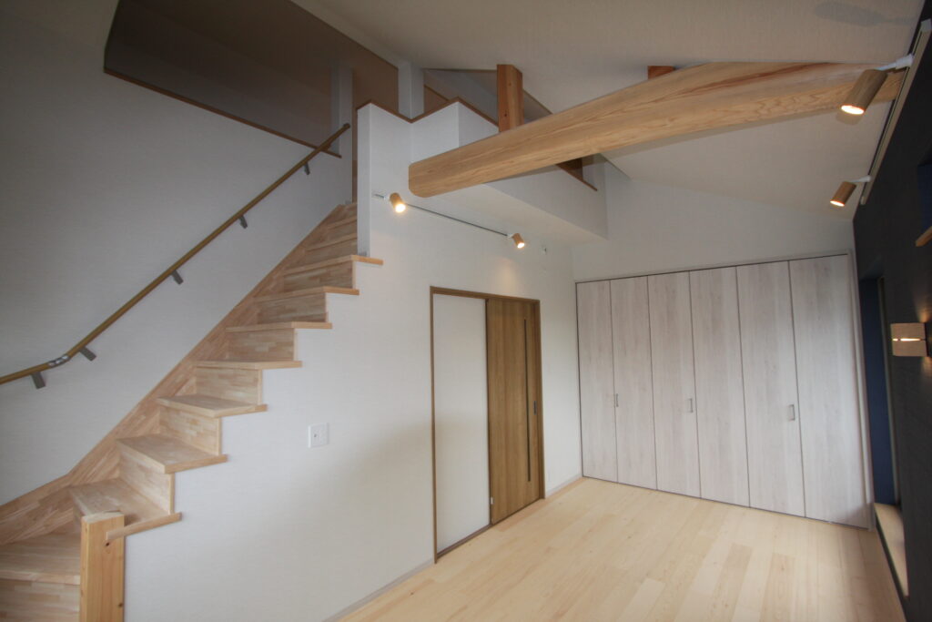 明るいフローリングに、美しく組まれた階段が自然と目に入り、どこかホッとする雰囲気を感じさせてくれます。天井は高く、梁(はり)のデザインが空間にやさしいアクセントを添えています。